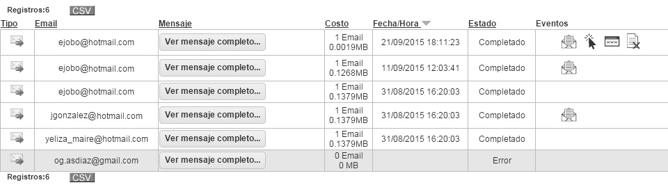 Al elegir esta opción podrás ver el detalle de todos tus envíos Email. La información mostrada será.: